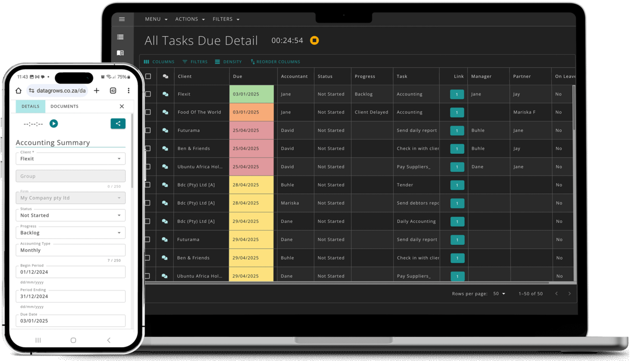 Once your clients have been added to DataGrows and services have been switched on, tasks will start to be scheduled for your clients and continue to be scheduled for future dates. Our overview dashboard then enables you to see at a quick glance exactly when, for example, a client's accounting or VAT is due, when their CIPC Annual return is coming up, when their financials are due, etc. If you click on any of these tasks, you can track progress, log time, and add notes so that you always know how far you are with the work for each client.
